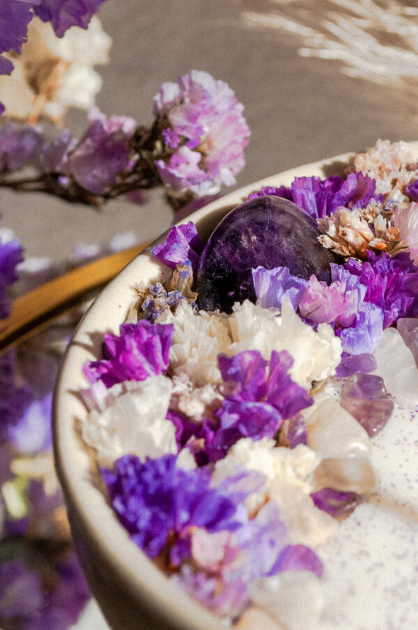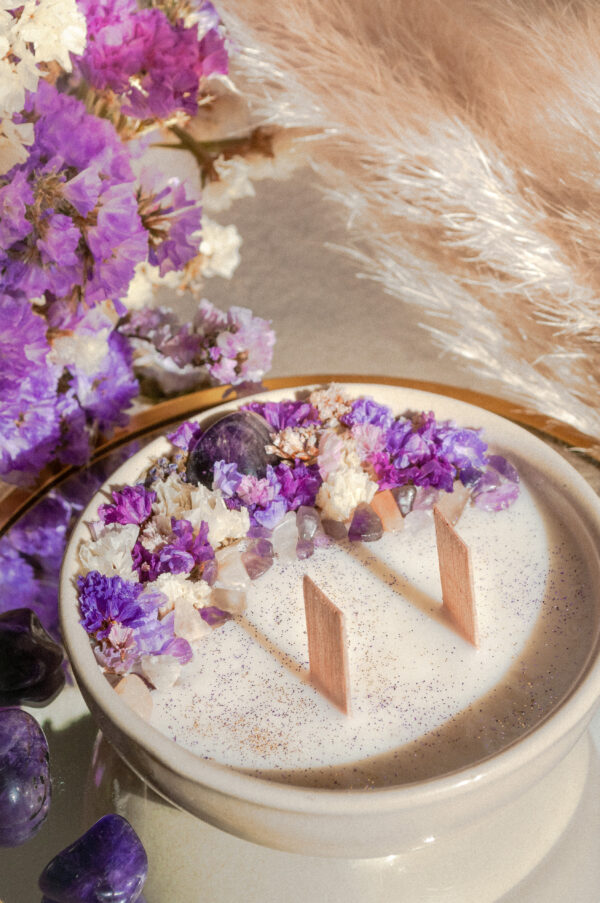 La bougie précieuse l’Apaisante est composée d’une pierre semi-précieuse d’améthyste et de cristaux naturels d’améthyste, de pierre de lune et de labradorite. Parfumé avec des fragrances naturelles de mûre, de violette, et de fleur de tiaré, elle est également décorée de fleurs séchées telles que la gypsophile, la lavande, le limonium, le statice … Chaque bougie est unique et faite à la main, on trouve donc des différences entre les différents modèles.