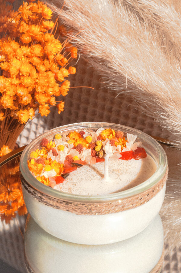 • LA PIERRE : La bougie est ornée d’éclats de cristaux de cornaline, de pierre de lune et d’oeil de tigre. La cornaline est la pierre de la bonne humeur et de la vitalité. Energisante, elle favorise la paix intérieure et l’épanouissement. Elle apporte confiance en soi et assurance.